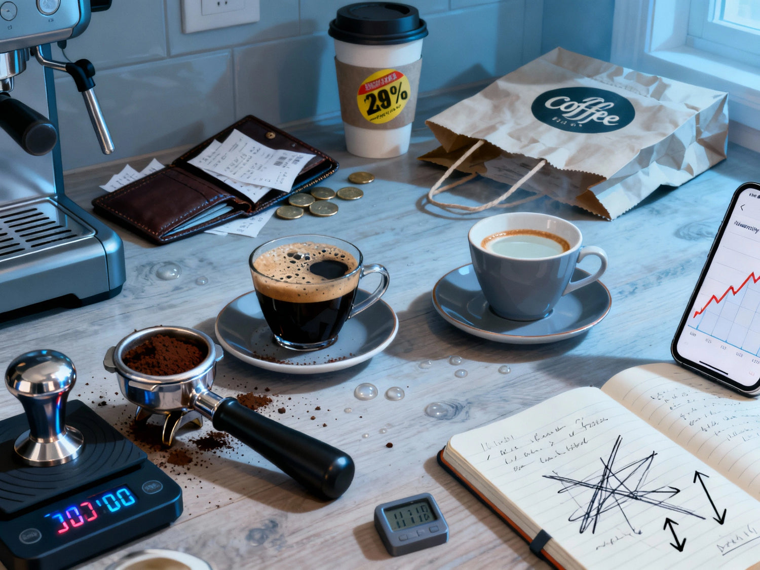 Example: 18 g coffee → 36 g espresso liquid in the cup. - Time: 25–28 seconds.