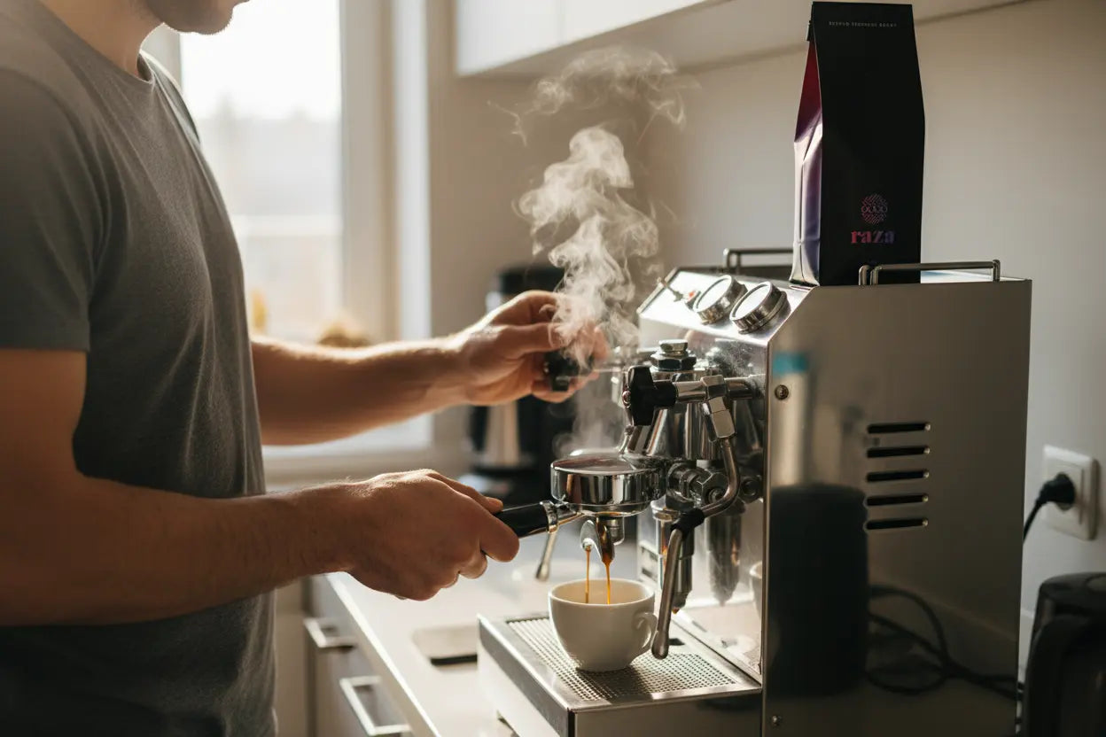 -Turn on the machine and let it warm up (at least 10–15 minutes).-Run a blank shot (without coffee) to heat the grouphead and portafilter.
